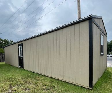 This current on lot inventory building is in Clay LP Smartside siding with Smart Guard it, has Black trim and a Black metal roof. This building comes with 36" 9 lite door with locking handle, 2) 2x3 insulated windows and 3/4" LP Legacy tongue & groove flooring.