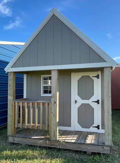 This current on lot inventory building is in Driftwood LP Smartside siding with Smart Guard it has White trim and a White metal roof. This building comes with 2) 36" 9 lite doors with a locking handle, 2) vertical transom windows, 6) 2x3 insulated windows, 6) sets of shutters, electrical package with extra receptacles, 24' porch with railing and 3/4" LP Legacy tongue & groove flooring.