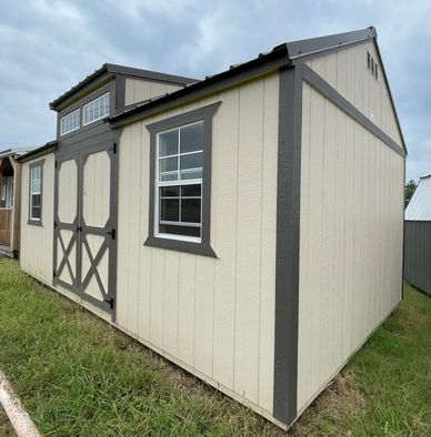 This current on lot inventory building is in Ivory LP Smartside siding with Smart Guard it has Charcoal trim and a Charcoal metal roof. This building comes with double barn doors with a locking T handle, 2) 2x3 windows, 6' dormer with two transom windows, two lofts for extra storage and 3/4" LP Legacy tongue & groove flooring.