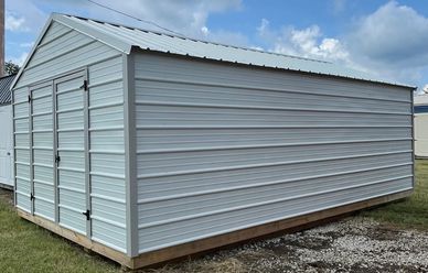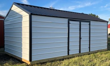 This current on lot inventory building is in Brilliant White metal siding with Black trim and a Black metal roof. This building comes with double doors with a locking T handle and 3/4" LP Legacy tongue & groove flooring.