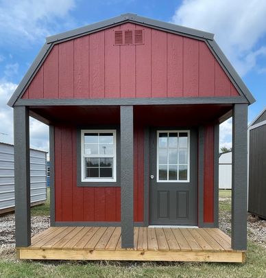 This current on lot inventory building is in Barn Red LP Smartside siding with Smart Guard it has Burnished Slate trim and a Burnished Slate metal roof. This building comes with a 9 lite door with a locking handle, 3) insulated 2x3 windows, 4x8 porch with railing, tow lofts for extra storage and 3/4" LP Legacy tongue & groove flooring.