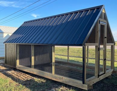 This current on lot inventory building is in Black LP Smartside siding with Smart Guard, it has Black trim and a Black metal roof. This building comes with 2) man doors with locking T handles, 8) nesting boxes, cut out from the run into the hen house so your girls have easy access, and comes with 3/4" LP Legacy tongue & groove flooring.