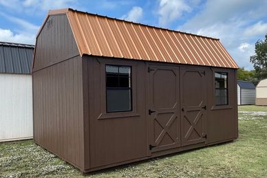 This current on lot inventory building is in Brown LP Smartside siding with Smart Guard it, has Brown trim and a Copper metal roof. This building comes with double barn doors with a locking T handle, 2) black 2x3 windows, U shaped loft for extra storage, 16' of double shelving and 3/4" LP Legacy tongue & groove flooring.