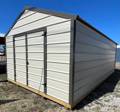 This current on lot inventory building is in Gallery metal siding it has Ivory trim and a Ivory metal roof. This building comes with double doors with a locking T handle, 2) 2x3 windows, and 3/4" LP Legacy tongue & groove flooring.