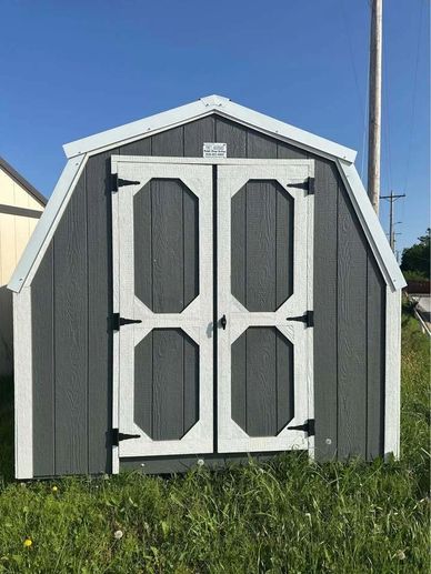 This current on lot inventory building is in Charcoal LP Smartside siding with Smart Guard it has White trim and a Brilliant White metal roof. This building comes with double barn doors with a locking T handle and 3/4" LP Legacy tongue & groove flooring.