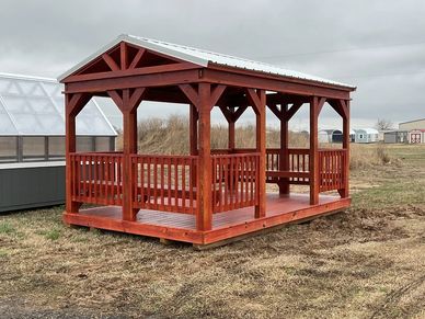 This current on lot inventory building is in Cedar stain and has a White metal roof. This building comes with two 10' bench up grades.
