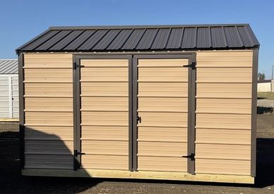 This current on lot inventory building is in Tan metal siding with it has Burnished Slate trim and a Burnished Slate metal roof. This building comes with double doors with a locking T handle and 3/4" LP Legacy tongue & groove flooring.