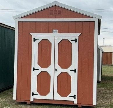 This current on lot inventory building is in Terracotta LP Smartside siding with Smart Guard it has White trim and a White metal roof. This building comes with double barn doors with a locking T handle and 3/4" LP Legacy tongue & groove flooring.