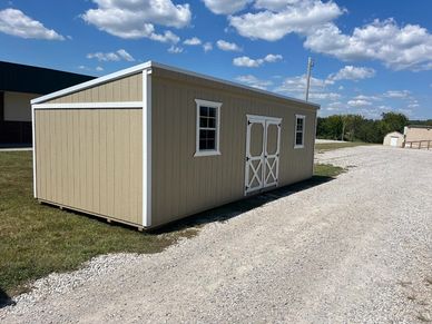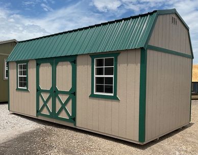 This current on lot inventory building is in Clay LP Smartside siding with Smart Guard it, has Dark Green trim and a Dark Green metal roof. This building comes with double barn doors with a locking T handle, 2) 2x3 windows, 2 lofts for extra storage, 20' of double shelves and 3/4" LP Legacy tongue & groove flooring.