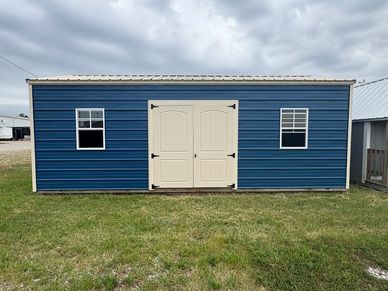 This current on lot inventory building is in Alamo metal siding with Gray trim and an Alamo metal roof. This building comes with double barn doors with a locking T handle and 3/4" LP Legacy tongue & groove flooring.