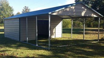 Combo units feature both an open carport concept and a well designed storage space solution that offers 10' of storage space. Combo units standard features include: two 24x36 windows, 36"x80" walk in door, one 8x8 garage door, 14 gauge galvanized steel framing, 29 gauge metal roofing with twenty year Beckers paint system, framing spaced 5' center and includes both roof and leg bracing for additional strength and stability. Concrete anchors and rebar anchors are included in base prices for units, for ground installations on units 12'-24' wide add ground anchor package. Base leg height is 9' tall.