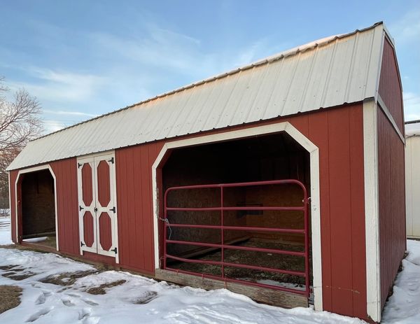 This current mark downs and repo building is in Barn Red LP Smartside siding with Smart Guard it has White trim with a Brilliant White metal roof. This building has two 12x12 stalls with locking gates and hay storage above, 8x12 tack room with built in saddle rack and double barn doors with locking T handle, tack room also has feed doors into each stall and 3/4" LP Legacy tongue & groove flooring. AS IS.